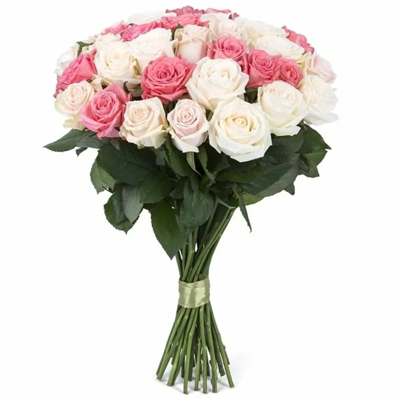 Букет состоит из 20 белых роз, 15 розовых роз, прозрачная упаковка, атласная лента.