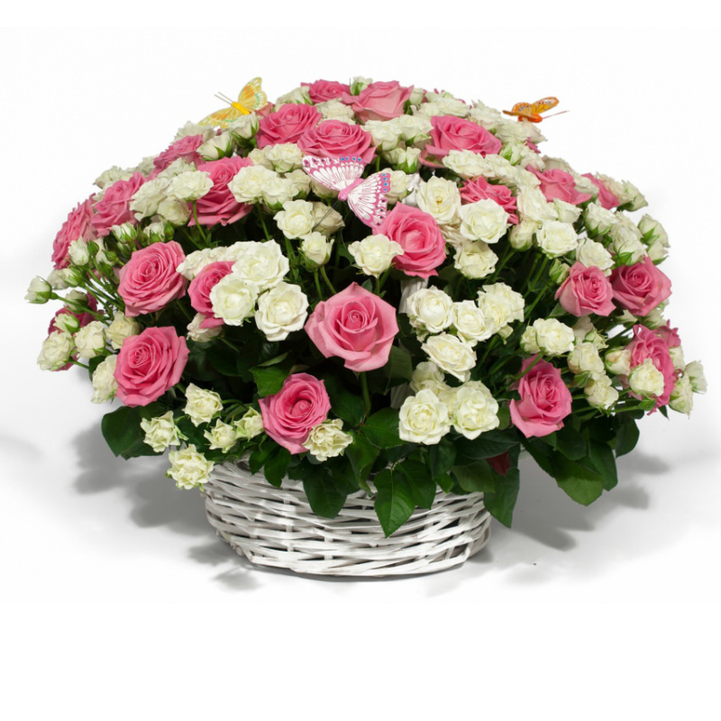 Букет состоит из 29 розовых роз, 26 белых кустовых роз, корзина.