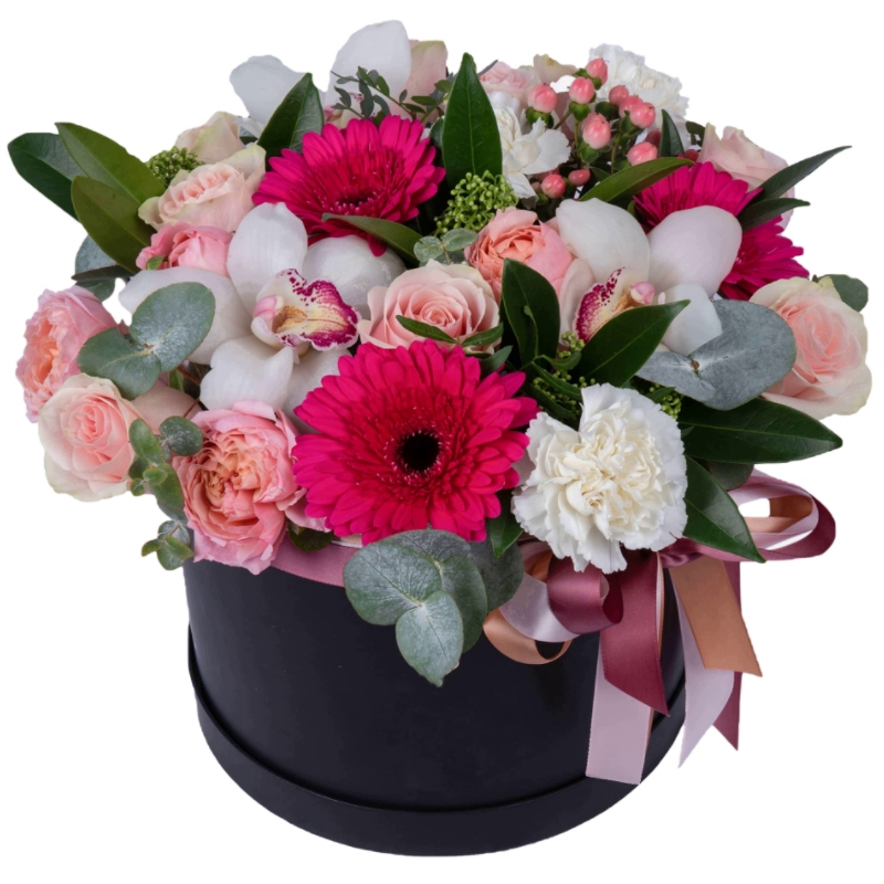 Букет состоит из 9 роз, 1 ветка пионовидной розы, 3 гвоздики, 3 герберы, 3 орхидеи, 3 гиперикум, 3 скиммия, зелень, коробка, оазис, атласная лента.