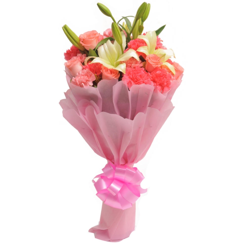 Букет состоит из 10 розовых гвоздик, 7 розовых роз, 2 ветки белой лилии, красивая упаковка, атласная лента.