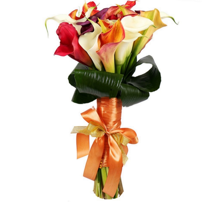 Букет состоит из MIX из 21 каллы, аспидистра, прозрачная упаковка, атласная лента.