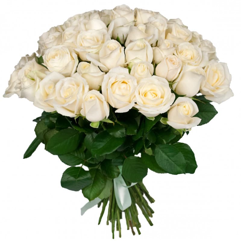 Букет состоит из 51 белая роза, прозрачная упаковка, атласная лента.